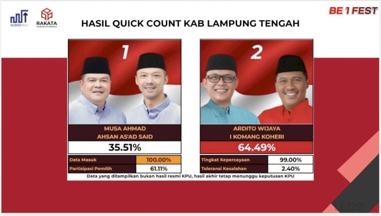Hasilnya, untuk Pilkada Lampung Tengah 2024 hasil hitung cepat Rakata adalah Paslon nomor urut 2 Ardito Wijaya-Komang Koheri unggul dengan perolehan telak mengalahkan petahana Bupati Paslon Nomor Urut 1 Musa Ahmad-Ahsan.